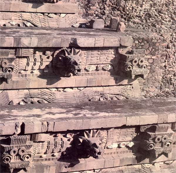 A fachada do templo de Quetzalcoatl é constituída por esculturas que representam serpentes