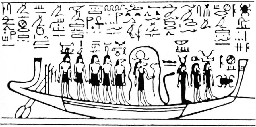 Rá, o deus Sol, percorre o rio da Duat na sua barca nocturna.
