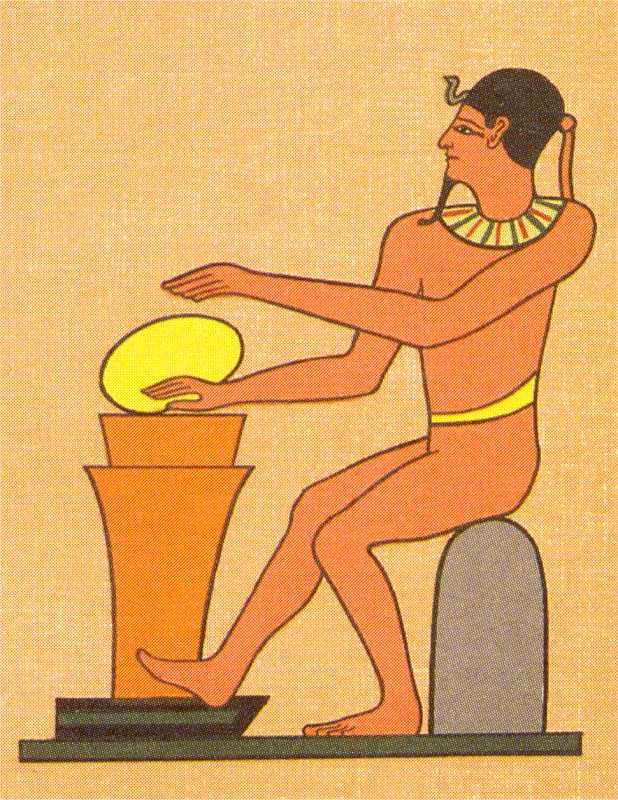 Ao lado, vemos PTAH modelando o ovo do mundo na roda de oleiro.