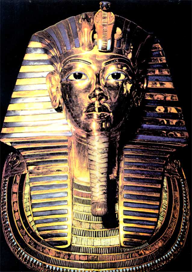 A máscara de ouro maciço, cravejada de pedras semipreciosas e de outras imitando pasta e vidro, destinava-se a ser colocada sobre o rosto mumificado do Rei, que morreu muito jovem.