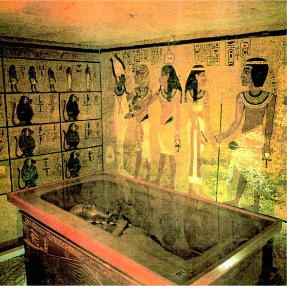 Interior do TÚMULO DE OURO do jovem faraó Tutancamon. Foi descoberto, intacto, três mil e duzentos anos após a sua morte, pelo arqueólogo Howard Carter, em 1922.