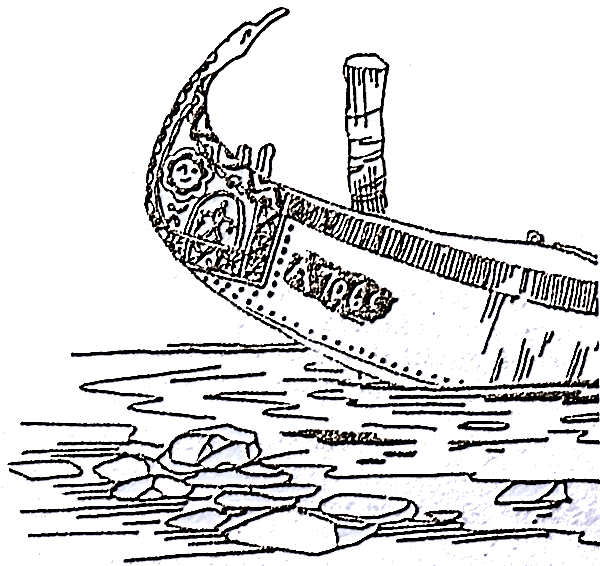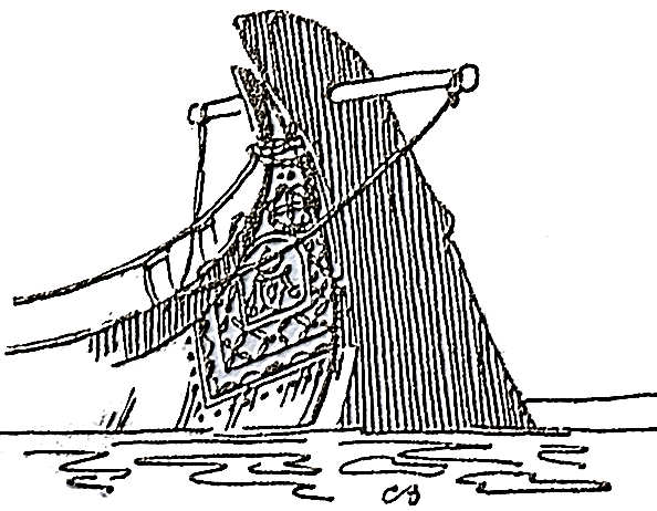 mais. A proa termina num pequeno corte recto. O leme tem