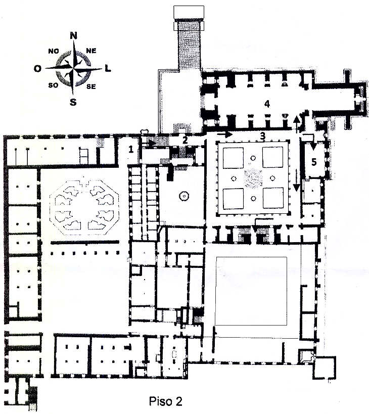 Carros (Entrada/Saída); 2•Portaria; 3•Claustro do Cemitério; 4•Igreja; 5•Sacristia; 6•Salão da Ouvidoria; 7•Aposentos do Abade
