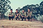 Oficiais e sargentos sentados na esplanada do edifício convertido em messe. Da direita para a esquerda: alferes Virgílio, Valle e Oliveira, e furriéis Canaveira, Santos e Pimenta, tendo atrás o soldado impedido da messe. (slide refª 608)