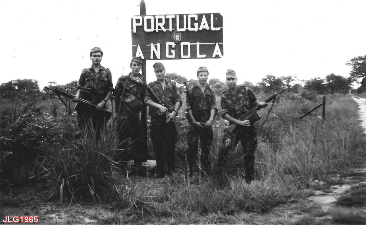 Elementos destacados em Caianda. Da esquerda para a direita: 1º cabo João, soldados Francisco José, Stoka, Belarmino e furriel Gomes. À direita a picada que liga a Caianda. Fisicamente estamos já em terreno da província do Katanga (República do Congo).