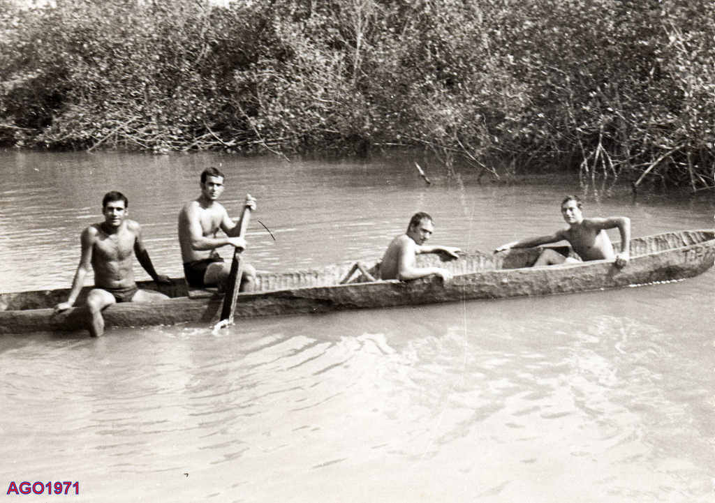 Deslocação num barco típico da zona. Da esquerda para a direita: ???, ???, ??? e ???. (C. Caç. 3307)