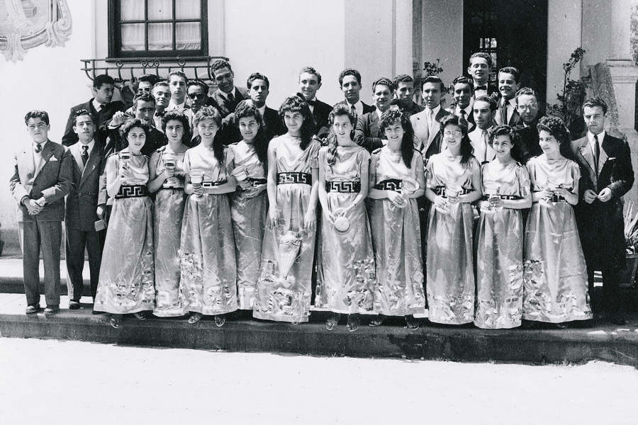 9 e 10 - Récita realizada em 6 de Maio. Participantes da Dança da Primavera. Fotografia tirada no Parque, sobre a ponte de pau. Foto de Diamantino Dias   11 e 12 - Alunos finalistas do ano lectivo de 1954/55. Foto junto à Casa de Chá do Parque. À frente, as meninas que participaram na dança grega da récita realizada em 6 de Maio de 1955. Foto de Diamantino Dias NOMES