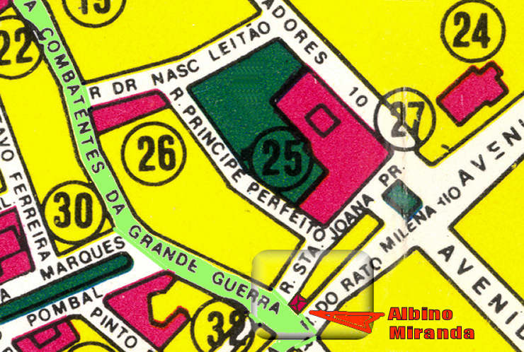 Na imagem, retirada de um mapa de Aveiro de 1988, inserido no «Roteiro de Aveiro. Cicerone» (1), uma pequena publicação de bolso no formato 133x88 mm e com um total de 126 páginas, temos a localização exacta do edifício onde existia a mercearia Albino Miranda. Vemos toda a Rua Combatentes da Grande Guerra, que marcámos a verde claro, e o quarteirão que desapareceu, bem como as ruas eliminadas: Rua de Santa Joana e Rua do Rato. A praceta de formato aproximadamente quadrado, entre este quarteirão e a Sé de Aveiro, tinha o nome de Praça do Milenário.