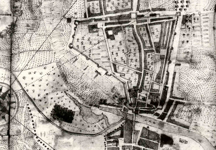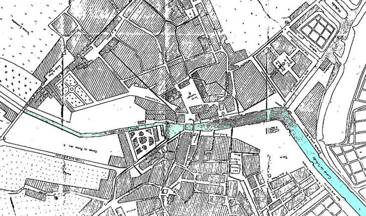 40. Neste mapa de finais do séc. XVIII, de autor anónimo espanhol, vemos o Canal Central com duas pontes. Só a parte superior da cidade está cercada de muralhas. O canal central apresenta uma bifurcação para a esquerda, correspondente ao esteiro do Cojo, tendo em conta as designações do mapa topográfico de 1780. Este mapa anónimo pode ser consultado utilizando a hiperligação: ███
