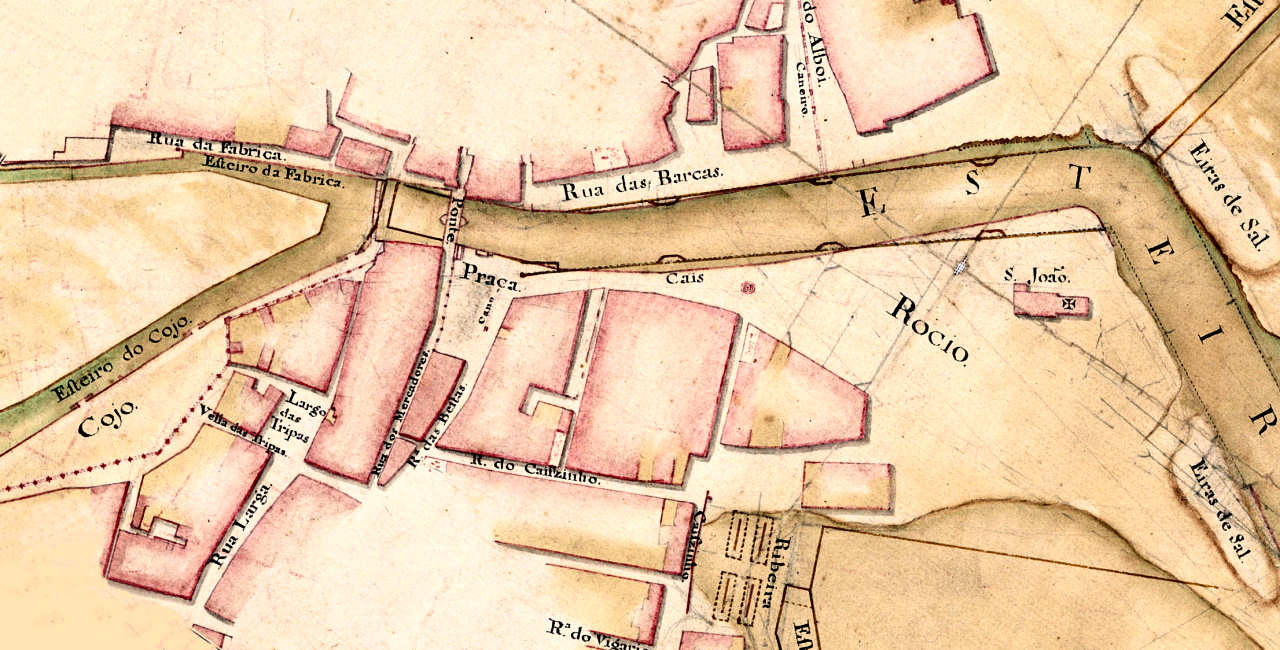 41. Esta imagem é um pequeno excerto do mapa topográfico do «Esteiro da Cidade de Aveiro» feito em Janeiro de 1781, a partir de um projecto de 2 de Agosto de 1780, a que demos orientação semelhante ao da imagem anterior. Verificamos que o esteiro bifurca: do lado direito, é o «esteiro da Fábrica»; do esquerdo, o «Esteiro do Cojo». O Cojo está delimitado por uma linha que, pelo desenho, nos faz lembrar o aqueduto que fornecia água à cidade. Infelizmente, não temos legendas explicativas. Este esteiro desapareceu e corresponde à área onde se situa a avenida Lourenço Peixinho. Entre os dois esteiros não há nenhuma edificação. Este mapa pode ser consultado utilizando a hiperligação: ███