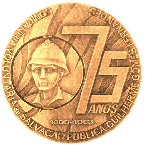 bombeiro alicerçado, ladeado, por setenta e cinco anos de
