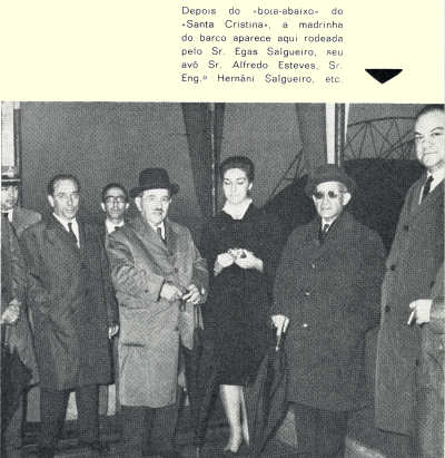 Serviu de madrinha para o «Santa Cristina» a menina Maria Teresa Estrela Esteves, filha do Sr. Dr. Manuel Esteves, que baptizou o navio com a simbólica garrafa de espumante, depois de lhe ter sido lançada a bênção pelo rev.º Bernardino Cristão, capelão da Base de S. Jacinto e prior da freguesia.