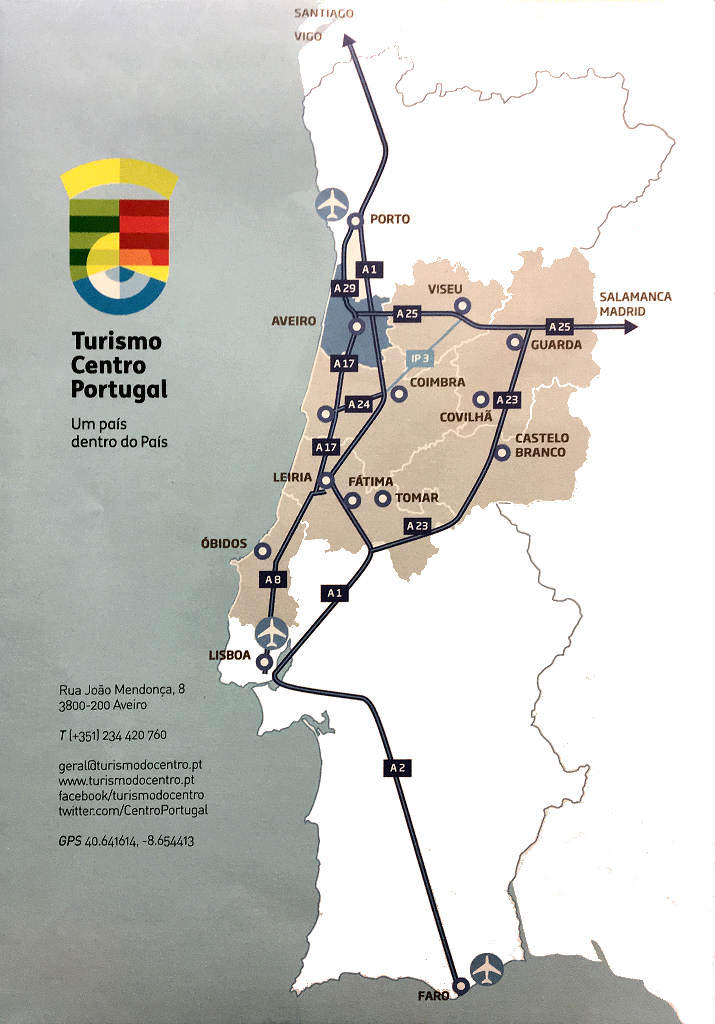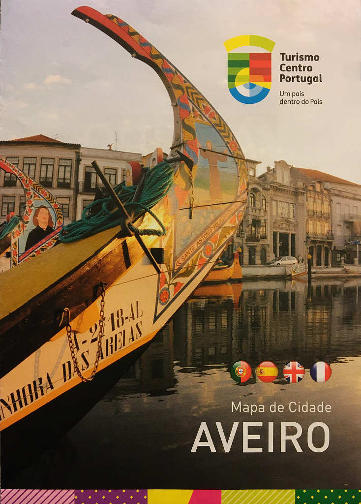 Dobrado em quatro partes, torna-se um folheto com as dimensões para caber nos nossos bolsos, apresentando na frente um aspecto do centro da cidade e, no verso, um mapa de Portugal com as principais vias de acesso a Aveiro.