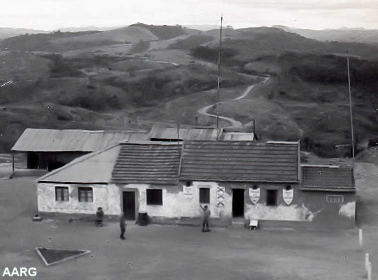 Vista aérea de Nambuangongo, mostrando em pormenor o depóslto de géneros, messe de sargentos e camarata de parte de furriéis. Da parte de trás deste edifício, ficava o refeitório de praças e a cozinha. Como pano de fundo, vista da picada para Quixico. (Nota - trata-se da mesma imagem do ficheiro 44, mas agora a original).