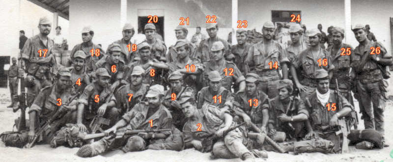 Imagem em alta resolução do 2º Pelotão da 3.ª Companhia de Caçadores  pára-quedistas após chegada de uma operação. Ver identificação da malta na imagem seguinte.