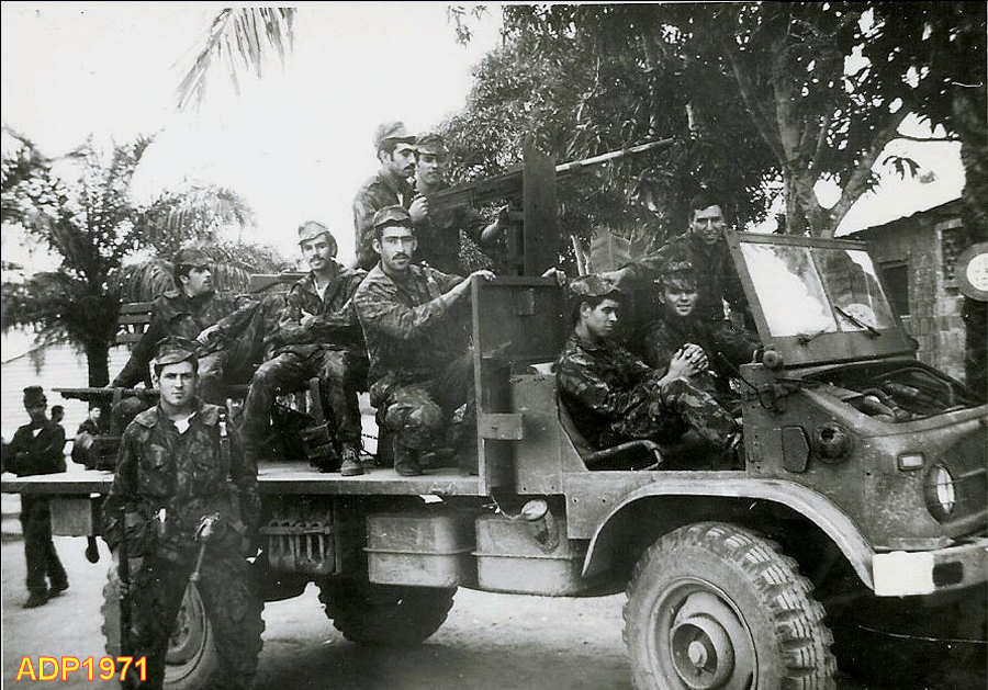 Três elementos da C. Caç. 2695. Da esquerda para a direita: ???, ??? e ???.