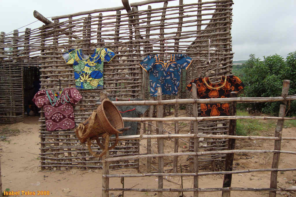 Mercado em Quimbele, com o «prêt-à-porter» exposto na estrutura de uma futura cubata.