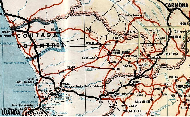 Mapa mostrando a área compreendida entre Luanda e Carmona (Uíje),  vendo-se a zona onde ficava situada a Fazenda Santa Isabel. As principais localidades desta área são Quitexe, Aldeia Viçosa, Cambamba, Célua, Fazenda Santa Isabel, Fazenda Liberato e Quisseque.