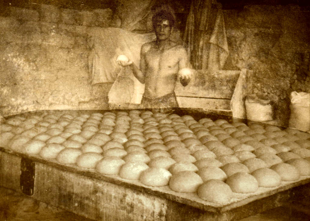 Fernando Sancheiro Gomes, ajudante de padeiro no Quixico 1972, com a massa na mão, preparando uma nova fornada para o pão-nosso de cada dia.