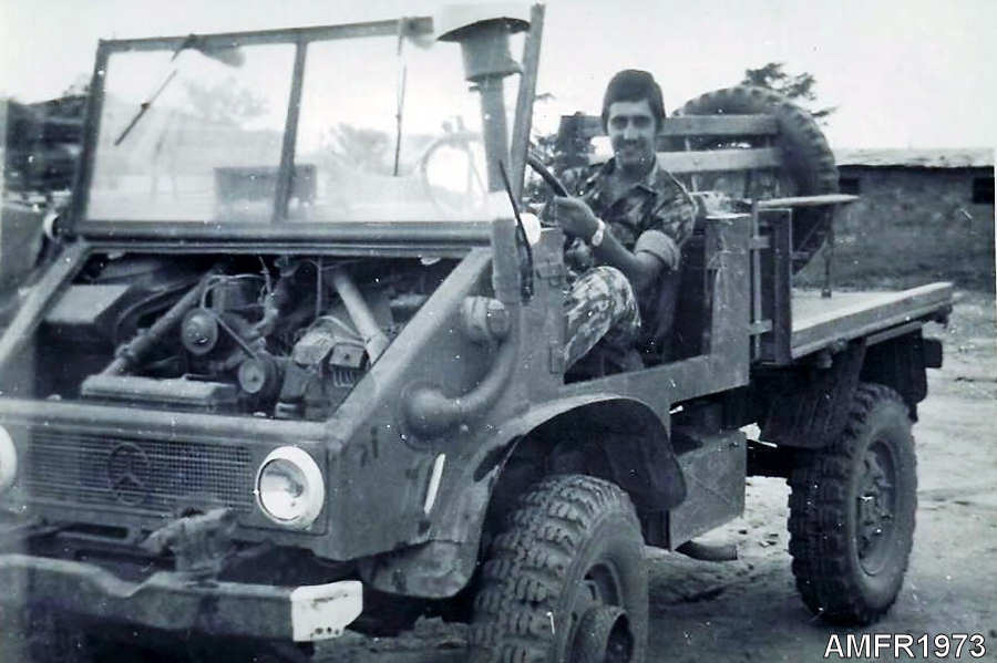 Sentado num dos unimogues da Companhia.