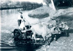 Travessia a vau do rio Vouga por carro de bois típico na época, provavelmente na zona de Novo Rio do Príncipe. Fotografia cedida pela Junta de Freguesia de Cacia.