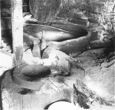 Figura 16: Pormenor da zona de prensagem, no lagar de Vila Viçosa, no conc. de Arouca, mostrando o pote, a sertã e o sãofridoiro. Dentro da sertã, pode-se ver um coco para caldear. Ver também o esquema da figura 17.