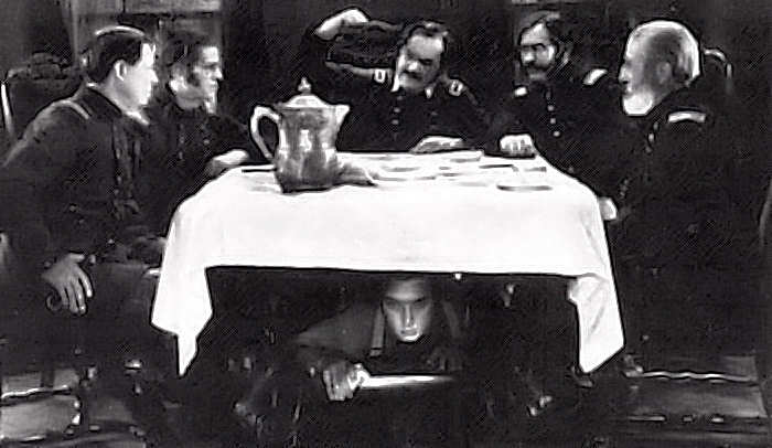 esconder-se debaixo de uma mesa de reuniões onde ouve os generais