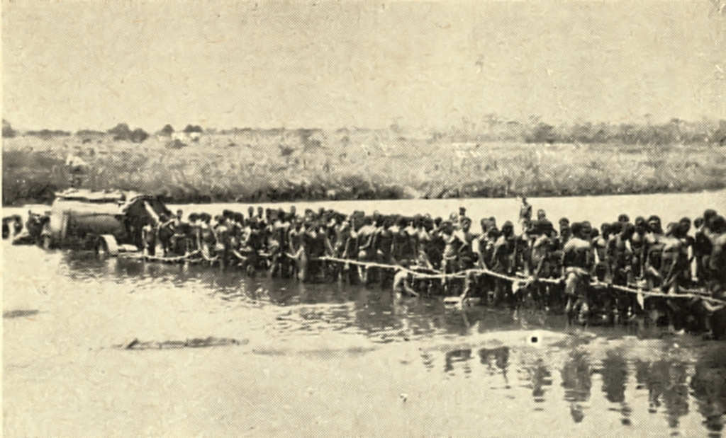 Lafaec (crocodilo), emergindo das águas. O dorso extenso de