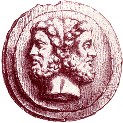Entre os deuses do Estado, havia JANO. Sob o seu comando estavam as estradas, protegendo, pois, partidas e chegadas. Representado com dois rostos opostos (um olhando para trás e o outro para a frente), é considerado por uns como nativo de Roma e por outros como originário da Tessália. Seja como for, atribuem-se ao seu reinado «as habituais características da Idade do Ouro: completa honestidade dos homens, abundância, paz profunda, etc.» E, ao que parece, nunca ninguém o difamou por ter duas caras, nem consta que ele fosse apoquentado por crises de identidade...