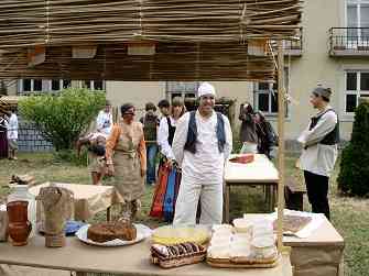 um vestido à luz das tendências medievais, vende bolos e doces, rodeada