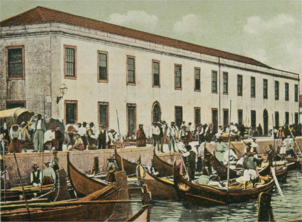 Aspecto do cais e Escola Industrial e Comercial Fernando Caldeira, fotografia tirada por volta de 1910. Esta imagem foi utilizada na época como postal ilustrado editado por Alberto Ferreira, do Porto.