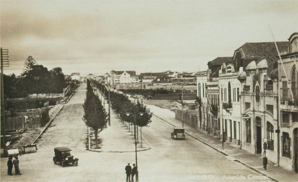 Aspecto da Avenida Central, na altura ainda vedada ao trânsito, actualmente com o nome do Dr. Lourenço Peixinho, e a Rua Almirante Reis, posteriormente a 1922, uma vez que já se vê na foto a fachada do Hotel Avenida, construído nesta data, de acordo com a inscrição existente no cimo da fachada..