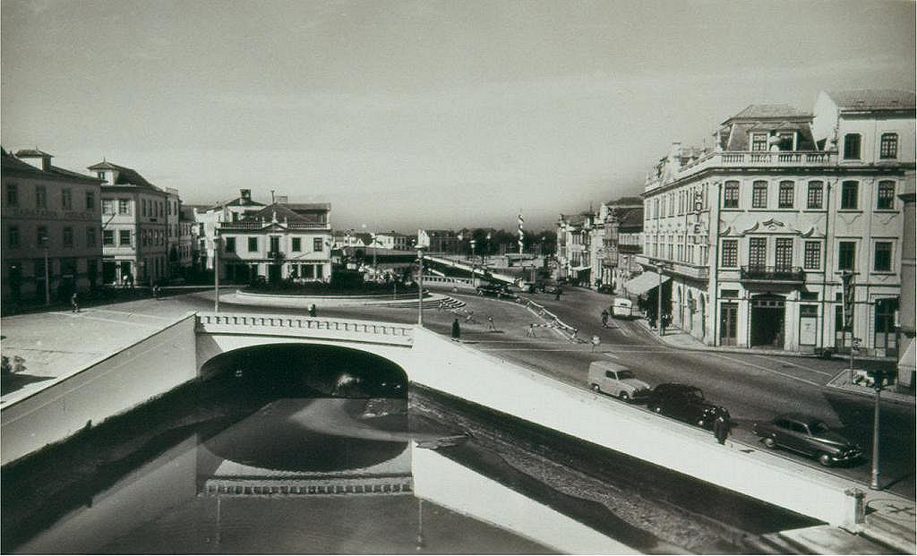 Aspecto do centro da cidade de Aveiro por volta de 1955, mostrando a mesma zona equivalente à imagem anterior. Ao centro da imagem, o antigo edifício da Empresa de Pesca de Aveiro. Ao fundo, o «saca-rolhas» que assinalava a entrada da Feira de Março. A «ponte-praça» foi inaugurada em 25/5/1952.