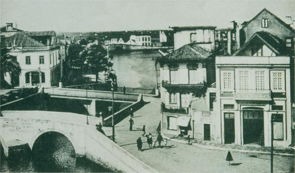Aspecto do centro de Aveiro ainda com as duas pontes, por volta de 1915. À direita, a entrada da rua José Estêvão.