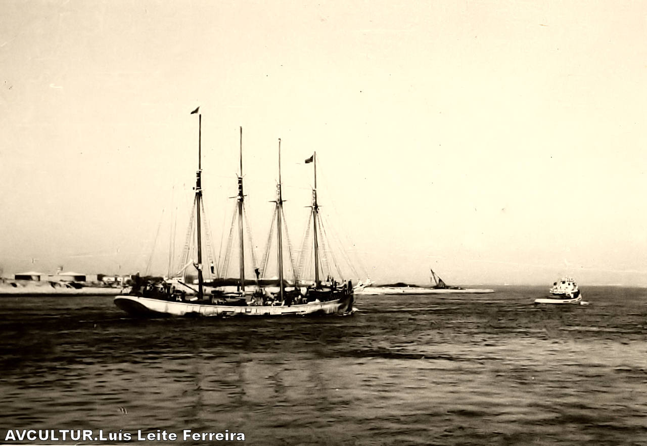 Entrada de um lugre na Barra cerca de 1953. Foto formato 9x12 em papel creme cedido pela filha de Luís Leite Ferreira. Ao fundo, os hangares da base de São Jacinto.