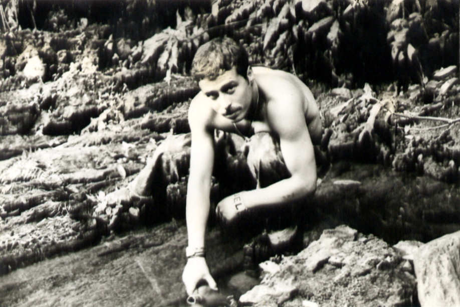 Enchendo o cantil de água numa linha de água durante um patrulhamento na zona de Bessa Monteiro.