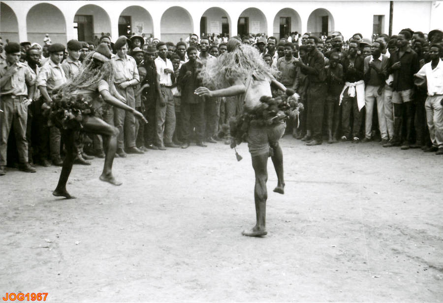 Danças africanas no dia de inauguração do Seminário Seráfico e pessoal militar que assistiu à cerimónia.
