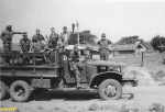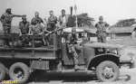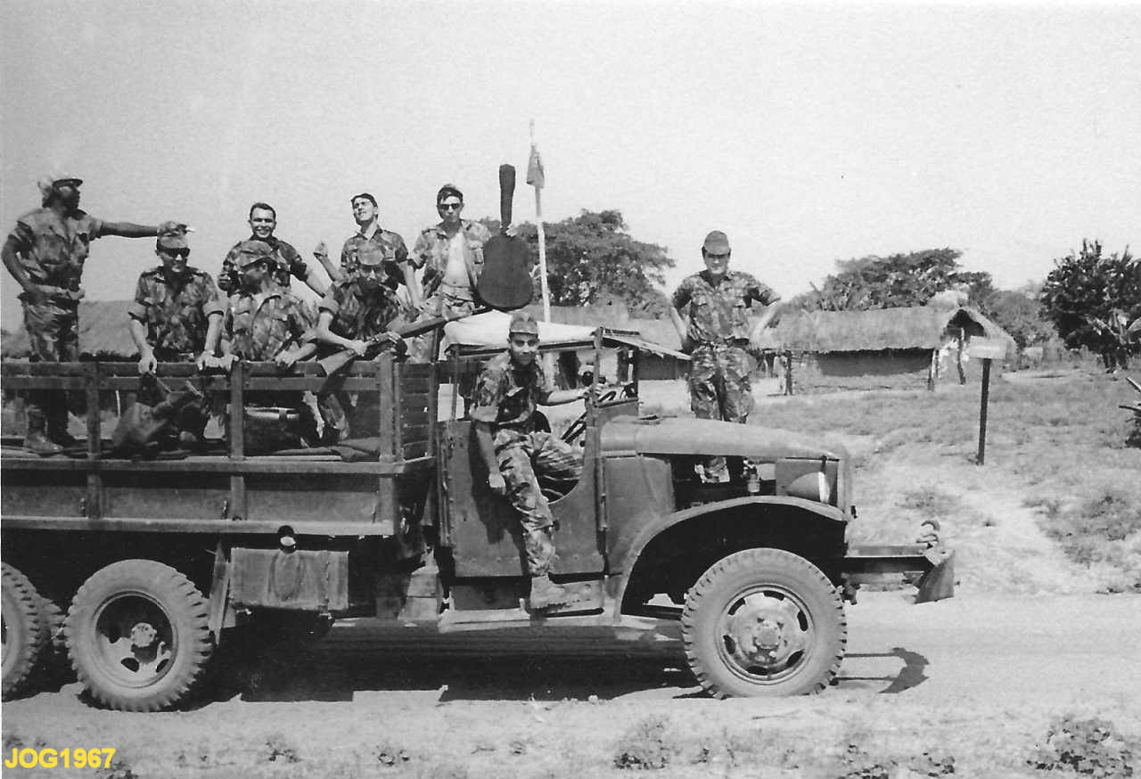 Foto obtida na picada Sanza, Negage, a poucos quilómetros do cruzamento para Cangola. Transporte na velha GMC de Cangola da Orquestra do B. Caç 1865. Na frente, o  furriel miliciano Gomes e o condutor Carvalho. Em cima, o fur. mil. Trepa, 1º Cabo Montenegro. Dos restantes já estão esquecidos os nomes.