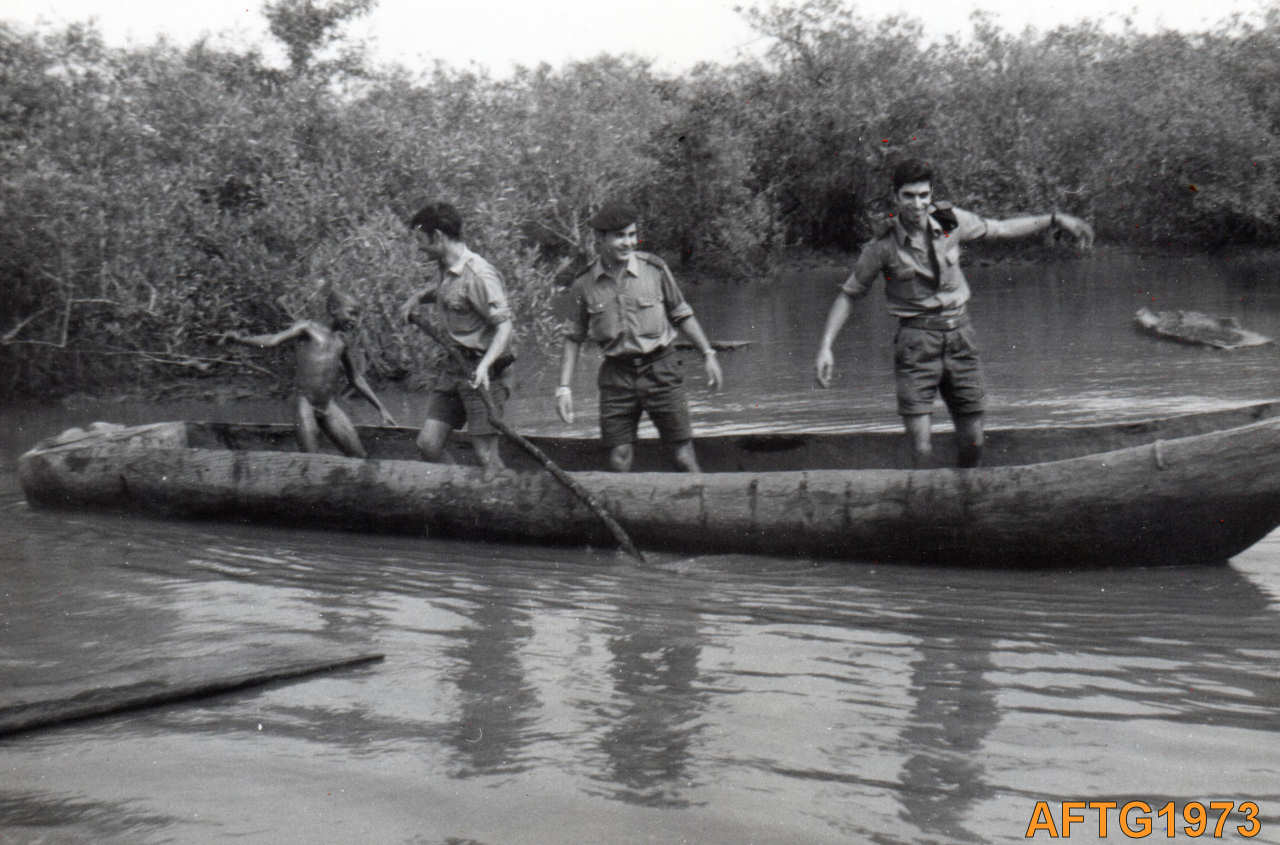 Elementos da Companhia de Comandos e Serviços (CCS) do Batalhão de Caçadores 4510. Na canoa, da esquerda para a direita, Nunes, Gonçalves, Rato e Nativo.