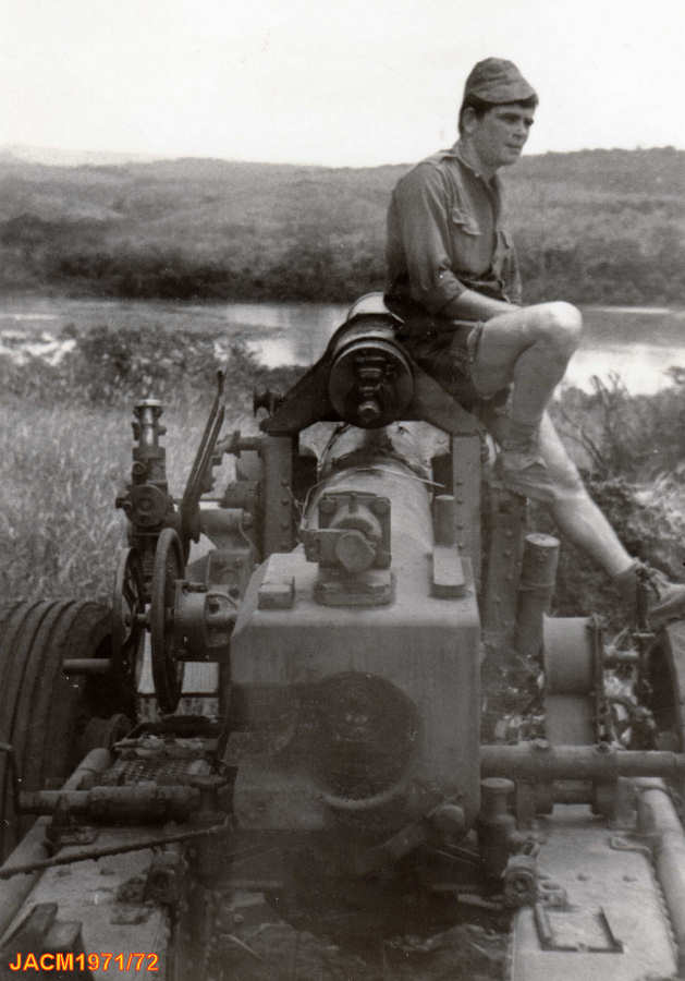Sentado em cima do obus K 15 cm/30 m/941, material adquirido em 1941 à casa alemã KRUPP,  na encosta para o rio Cuango e voltado para a República do Zaire.