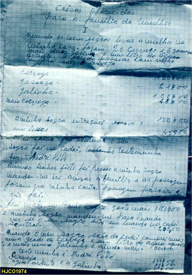 Documento apresentado pelo marido com uma relação de todas as despesas efectuadas com a família da mulher, exigindo agora a devolução do dinheiro na entrega da mulher aos pais. Para uma melhor leitura, dividimos o documento nas duas metades.