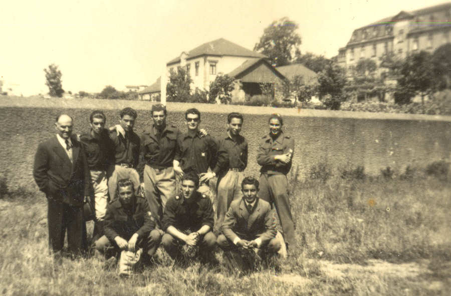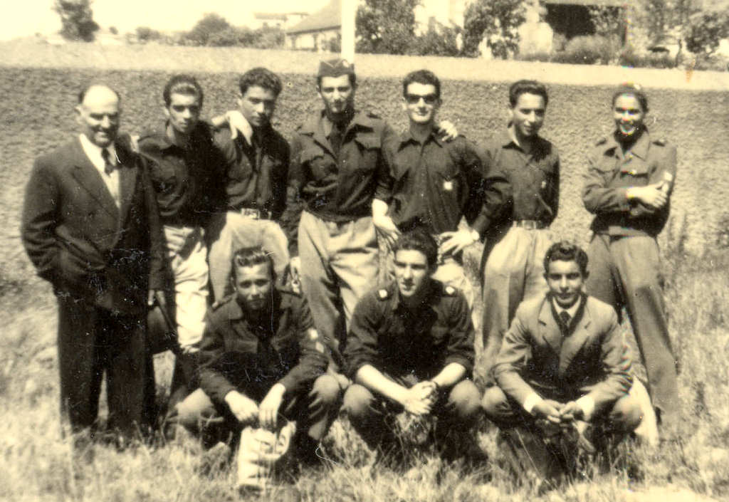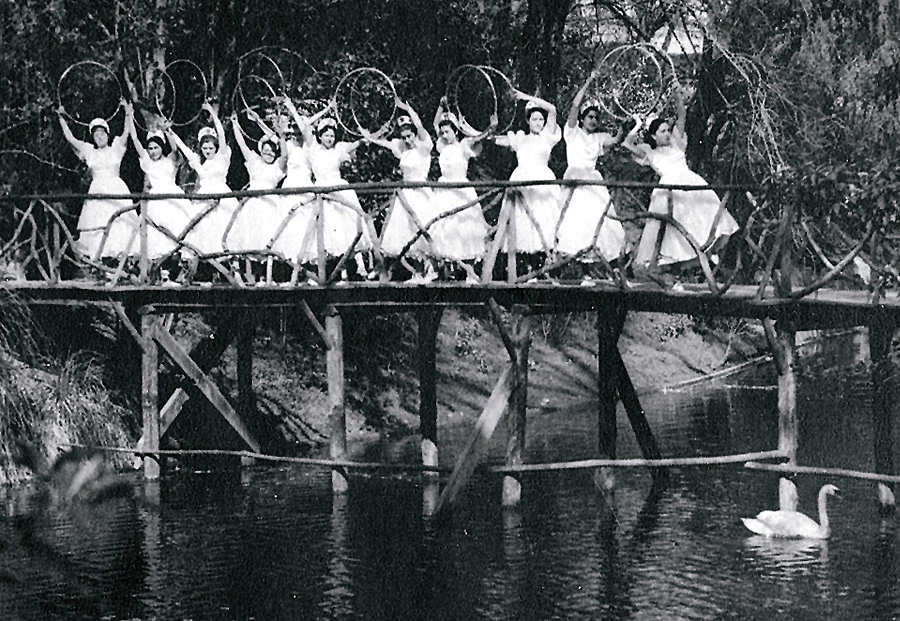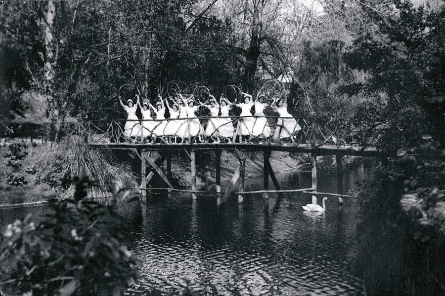 9 e 10 - Récita realizada em 6 de Maio. Participantes da Dança da Primavera. Fotografia tirada no Parque, sobre a ponte de pau. Foto de Diamantino Dias   11 e 12 - Alunos finalistas do ano lectivo de 1954/55. Foto junto à Casa de Chá do Parque. À frente, as meninas que participaram na dança grega da récita realizada em 6 de Maio de 1955. Foto de Diamantino Dias NOMES
