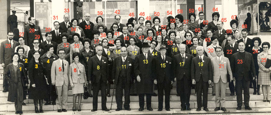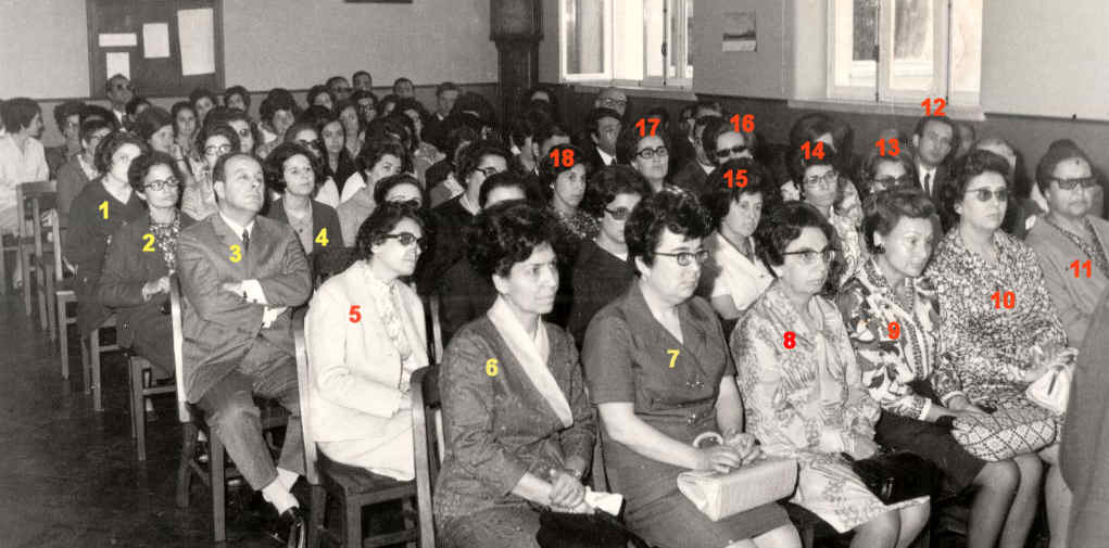NOMES: 1.???; 2.???; 3.Graça Veleda; 4.???; 5.José Lau; 6.Maria Adelaide Lau; 7.???; 8.Carneiro da Silva (Mat.); 9.???; 10.???; 11.Orlando de Oliveira (Reitor); 12.???; 13.José Pereira Tavares (antigo reitor); 14.???; 15.Álvaro Sampaio; 16.Albano da Conceição; 17.Euclides Araújo; 18.???; 19.???; 20.???; 21.???; 22.Alfredo Santos; 23.Padre Mário Sardo; 24.Helena Vidinha; 25.Palmira Araújo; 26.Sá Chaves; 27.Idália Sá Chaves; 28.Jorge Godinho; 29.Cecília Sacramento; 30.???; 31.???; 32.???; 33.???; 34.???; 35.Joana Vaz; 36.José Matos; 37.Noémia Margarida; 38.???; 39.Amélia Rosa; 40.???; 41.???; 42.???; 43.???; 44.Natália Pires; 45.Teresa Caldeira; 46.Rosa Amélia; 47.Maria Vieira; 48.???; 49.Alda Gomes; 50.Alice Barata Salgueiro; 51.???; 52.???; 53.???; 54.Eneida Piçarro; 55.Lucinda Conceição; 56.???; 57.Maria Otília Osório; 58.Palmira Couto; 59.Helena Maltez; 60.Lurdes Boavida; 61.António Maltez; 62.Venília Sá; 63.Fátima Bóia; 64.???; 65.Aurélio Fernandes; 66.Ermelinda Campos; 67.Lindonor Silveirinha; 68.José Melo Cunha.