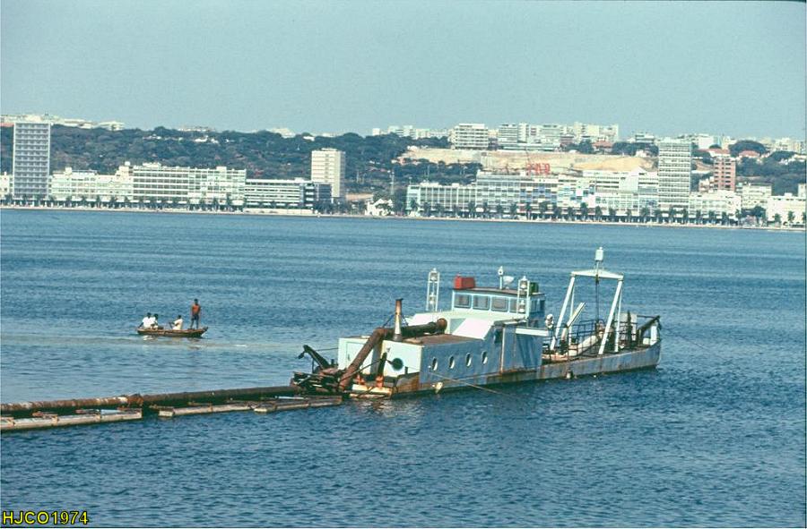 Luanda vista da Ilha, tendo em primeiro plano uma draga.