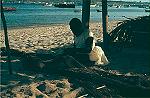 Zona piscatória na Ilha de Luanda, vendo-se alguns abrigos e embarcações, entre as quais alguns dongos na areia.