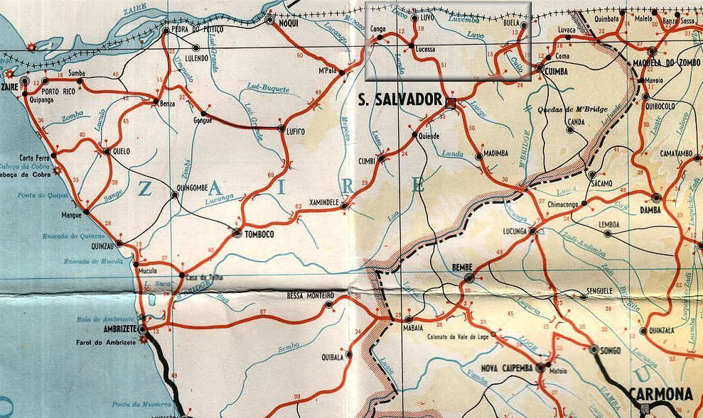 Mapa detalhado da Província do Zaire de Angola. Era este o caminho mais fácil para Magina: saída de São Salvador, pelo cruzamento do Lucossa, para Mamarrosa (onde estava sediada a CCS do B. Art. 1852). Magina fica na linha da fronteira entre Buela e Luvo, junto aos rios Lufusso, Sela e Luvo. As outras companhias do batalhão estavam sediadas no Luvo e em Canga. Outro itinerário para lá chegar era S. Salvador pelo caminho para Cuimba-Pangala, cruzamento para a Buela, e depois caminho para Magina-Mamarrosa.