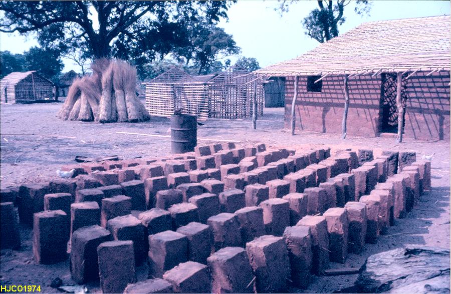 Secagem ao sol dos adobes de argila. Na imagem, vê-se uma cubata construída com este material. Ao fundo, molhos de colmo para os telhados. (Slide refª 1001).