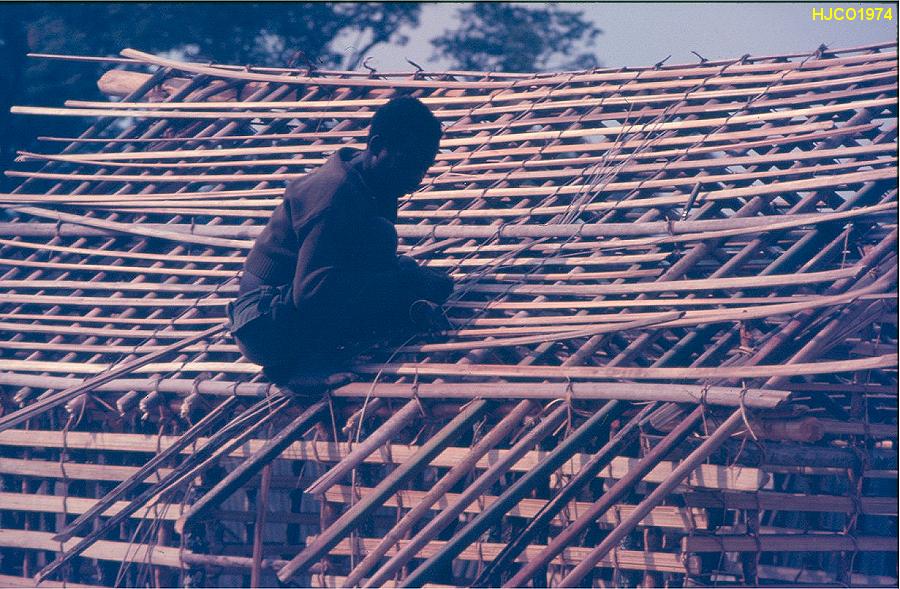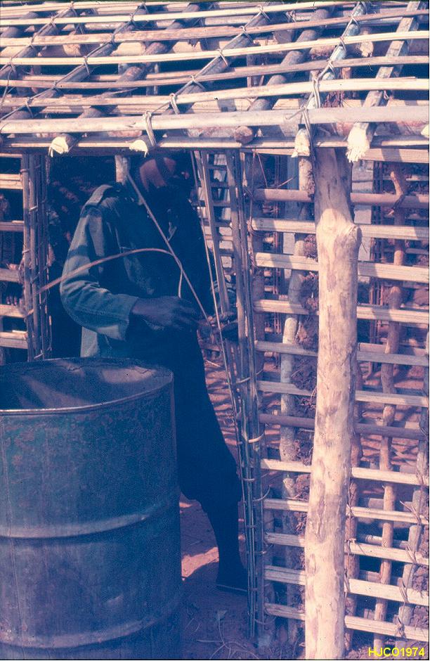 Construção da estrutura que irá suportar a cobertura de colmo da cubata. Estas, construídas com estacas de madeira, são depois revestidas de argila. (Slide refª 1004).