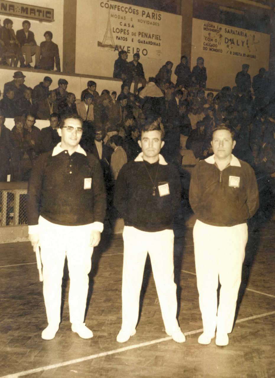 Durante um jogo em Aveiro, na década de 1960. Da esquerda para a direita: José Carvalho, Vitorino Gonçalves e Fernando (?). Foto 18x24 cm.