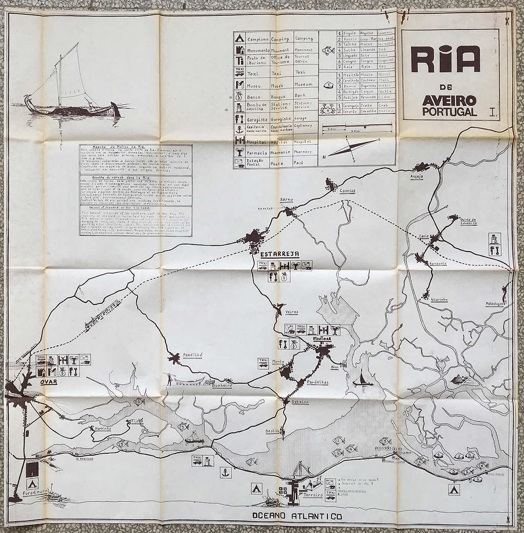 Dito tudo isto, que não é pouco, lamentamos que no original não constem nem a data nem a autoria deste trabalho. Também não é de admirar que os autores não tenham colocado os respectivos nomes, uma vez que a base de trabalho destes e de outros mapas eram geralmente as cartas topográficas do exército. Seja como for, não deixou de ser uma excelente trabalheira. E estes particularmente valorizados pelas ilustrações e textos explicativos em três línguas, coisa que não se encontra nas cartas do exército, que fomos obrigados a conhecer e utilizar durante o nosso período de dois anos de serviço militar. Sabemos que, muito provavelmente, a nossa «relíquia» da Ria de Aveiro será da década de 1960, porque um dos desenhos apresenta o centro da nossa cidade com a ponte-praça tal como os aveirenses a passaram a conhecer a partir de 1952, ano em que foram concluídas as obras de transformação das duas antigas pontes de Aveiro numa única. De acordo com a consulta efectuada no «Calendário Histórico de Aveiro», inserido no espaço «Aveiro e Cultura», em 25 de Maio de 1952, «foram inaugurados três melhoramentos de importância decisiva para a cidade: a ponte-praça, o reservatório de água para o abastecimento da rede urbana e, na Quinta das Agras, o novo edifício do Liceu Nacional de Aveiro, de acordo com o “Correio do Vouga” de 31-5-1952. Logo, o mapa da Ria terá de ser posterior a esta data.